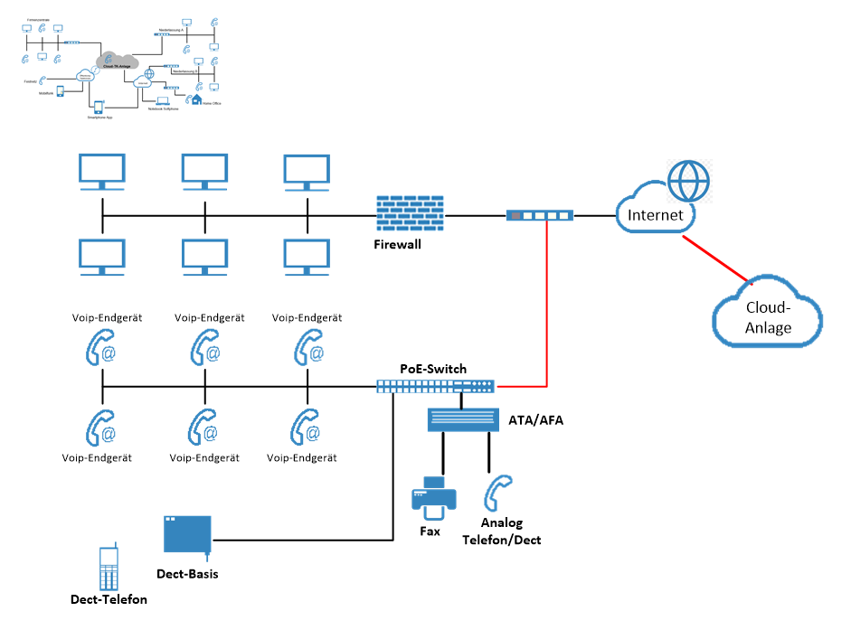 Für größtmögliche Flexibilität und Betriebssicherheit sollte die Telefonanlage in einem – vom Firmennetzwerk getrennten – Telefonnetzwerk betrieben werden. Diese Netzwerkarchitektur bringt zahlreiche Vorteile. |
